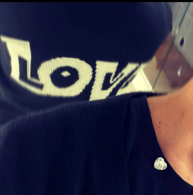Bottone gioiello a cuore applicato a mano sullo scollo.
